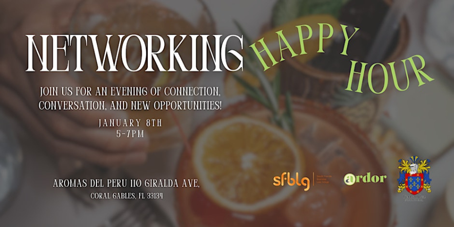 Welcome to NETWORKING HAPPY HOUR! Join us at Aromas del Peru on January 8, 2026 at 5:00 PM for a fun evening of networking and socializing. This is a great opportunity to meet new people, make connections, and unwind after a long day. Don’t miss out on this chance to expand your professional circle in a relaxed and casual setting. See you there!